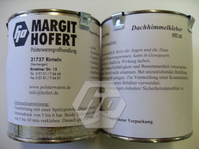 Automobilkleber 1030F à 1000 ml, aromatenfrei wärmefester Klebstoff zur Verklebung von Kunstleder- Himmelverkleidungen auf lackierten bzw. grundierten Blechen oder zur Verklebung von Textilien, Filzen usw. geeignet. lange Offenzeit, sehr hohe Anfangshaftung nicht nachklebend spritzfähig Hitzebeständig bis ca. 180 °C